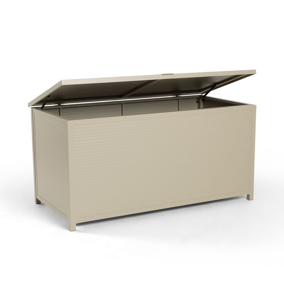 Die Roma Cushion Box XL bietet großzügigen Stauraum für Outdoor-Kissen, Auflagen und Gartenaccessoires.Gefertigt aus pulverbeschichtetem Aluminium in der Farbe Linen – ein moderner Greige-Ton aus Grau und Beige – fügt sich die Box harmonisch in moderne Terrassen- und Gartenkonzepte ein.